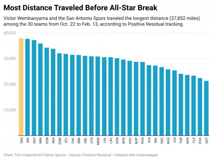 全明星前旅行最遠(yuǎn)距離:根據(jù)Positive Residual的追蹤,文班亞馬和馬刺從1022日到213日之間,旅行的總距離(37,852英里)在30支球隊(duì)中排名第一。