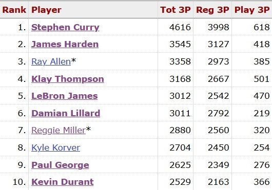 本場(chǎng)比賽過(guò)后,庫(kù)里生涯(常規(guī)賽+季后賽)的三分命中數(shù)來(lái)到4618記,距離5000記還有382記。