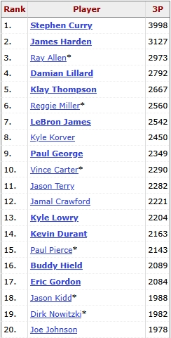 庫(kù)里達(dá)成4000記三分堪稱(chēng)劃時(shí)代的成就,縱觀現(xiàn)役球員,僅少數(shù)幾位具備沖擊這一里程碑的理論可能性: