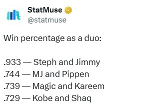 庫里+巴特勒勝率93.3%!美媒對(duì)比:喬丹皮蓬74.4% 科比鯊魚72.9%
