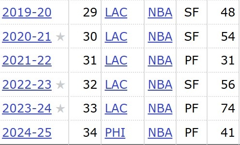 據(jù)統(tǒng)計(jì),本賽季喬治出戰(zhàn)41場(chǎng),是他自2021-22賽季以來(lái)出戰(zhàn)最少的一個(gè)賽季,近6年,他已經(jīng)5次出戰(zhàn)不足60場(chǎng),具體如下:
