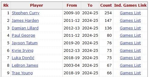 據(jù)統(tǒng)計(jì),這是特雷-楊生涯第67次單場砍下至少30分且投進(jìn)至少5記三分,他也追平詹姆斯排在歷史第8位。