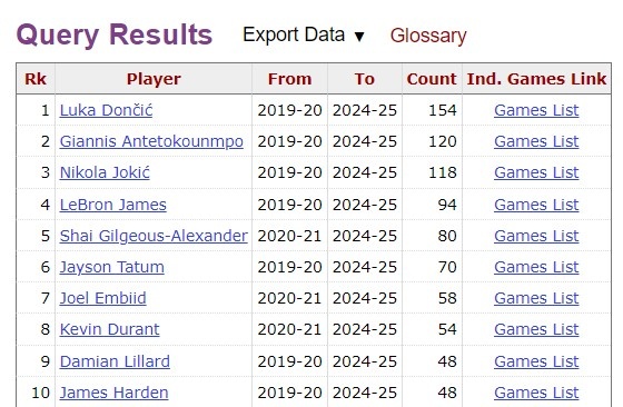 2020年以來(lái)的30+5+5場(chǎng)次榜單:東契奇155場(chǎng)居首 字母哥120場(chǎng)第2