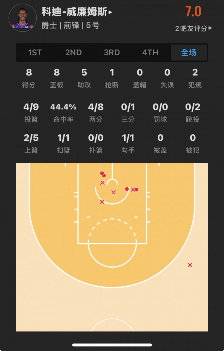 爵士10號秀 科迪-威廉姆斯 登場26.9分鐘