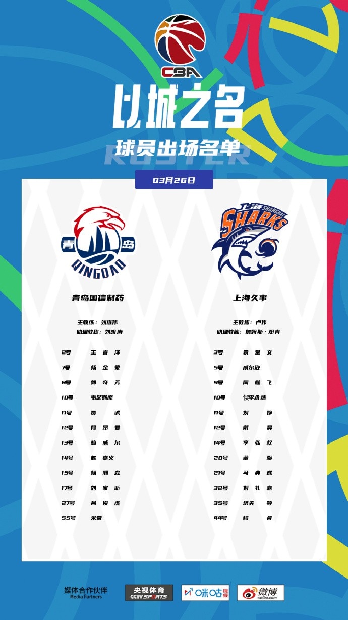 3月26日訊 今晚7點(diǎn)35分,青島男籃將在主場(chǎng)迎戰(zhàn)上海男籃。