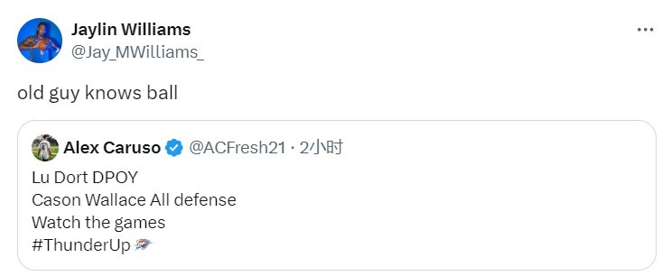 杰林-威廉姆斯對此也十分認同,他轉(zhuǎn)發(fā)了卡魯索的這條動態(tài),并在旁邊寫道:“老將懂球?!?/p>