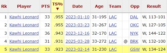 - 小卡今天以93.1%真實命中率砍下30+ 生涯152場30+中第4高效