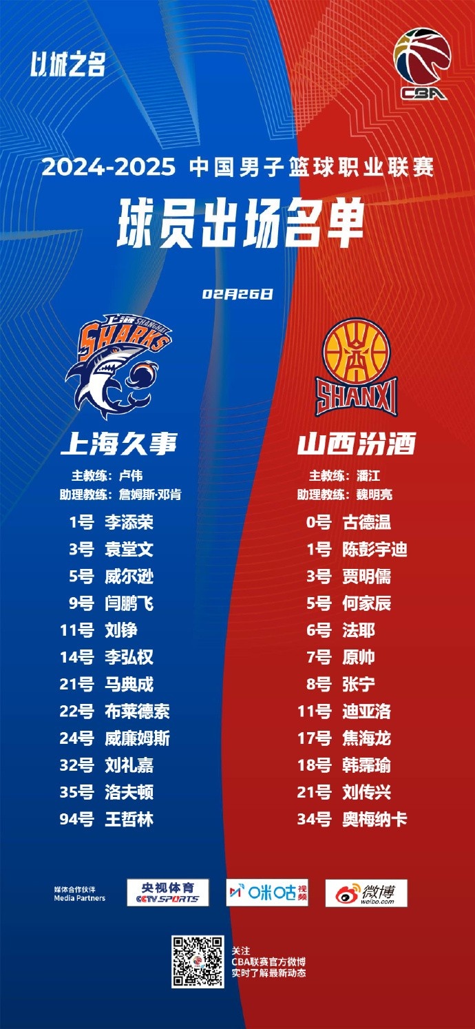 2月26日訊 CBA常規(guī)賽,上海將對陣山西。