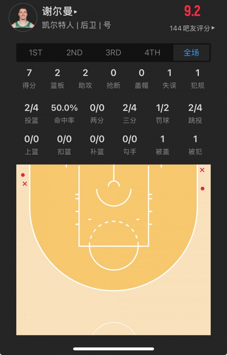 凱爾特人30號(hào)秀 貝勒-謝爾曼 登場(chǎng)19.0分鐘