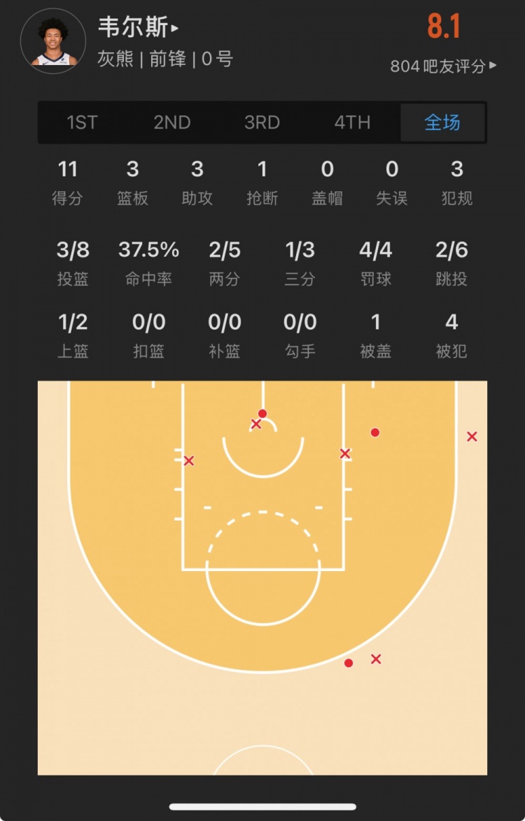 灰熊39號(hào)秀 杰倫-韋爾斯 登場(chǎng)23.6分鐘