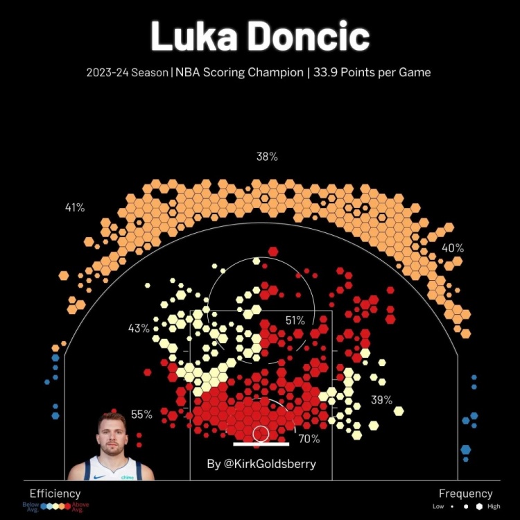 有了東契奇,湖人隊(duì)就擁有了籃球界最好的年輕得分手,同時(shí)也是本世紀(jì)20年代得分能力的典范。在此前7個(gè)賽季中,這位25歲的斯洛文尼亞人場(chǎng)均得分(28.6分)在NBA歷史上排名第三,僅次于邁克爾-喬丹和威爾特-張伯倫。憑借已經(jīng)獲得的5次NBA最佳陣容一陣的榮譽(yù),東契奇是有史以來(lái)成就最高的年輕球員之一。上賽季,東契奇以場(chǎng)均33.9分的表現(xiàn)贏得了得分王的頭銜,當(dāng)時(shí)他年僅24歲。東契奇的投籃分布圖證明他完全是一位現(xiàn)代籃球的球員,他在三分線外和禁區(qū)內(nèi)都表現(xiàn)出色。