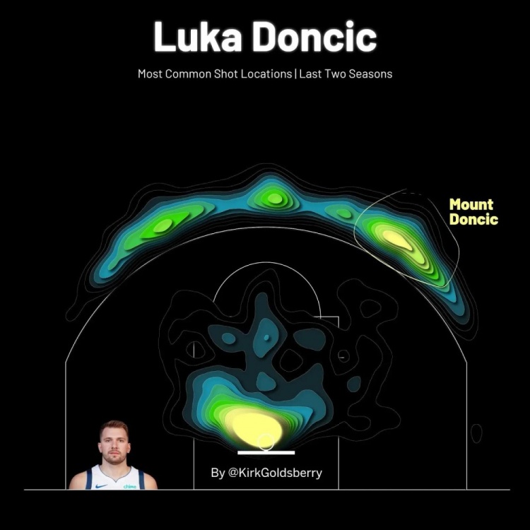 當(dāng)你繪制出東契奇最常見的投籃位置時(shí),有兩個(gè)熱點(diǎn):一個(gè)在籃筐附近,另一個(gè)是在三分線外左側(cè)45度處。這個(gè)外線熱點(diǎn)正是東契奇在周日的比賽中讓布勞恩上當(dāng)?shù)牡胤健@也是東契奇最喜歡的起舞的位置。