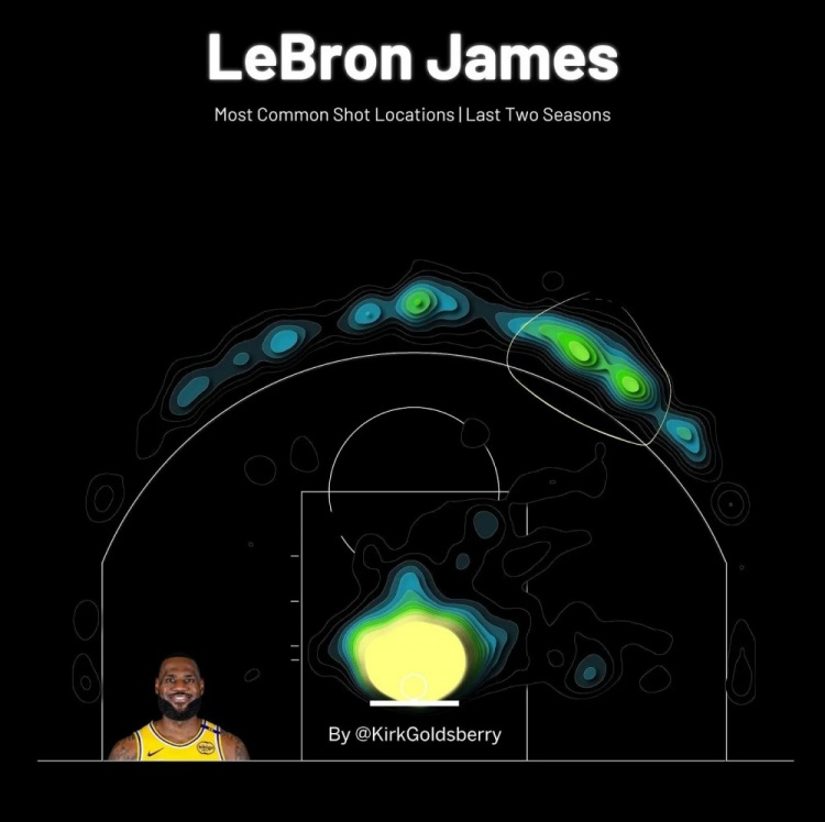 這與卡爾-馬龍和約翰-斯托克頓的情況不同。詹姆斯和東契奇都喜歡球場(chǎng)上的相同位置,兩人都偏愛三分線外左側(cè)45度以及突破至籃下。