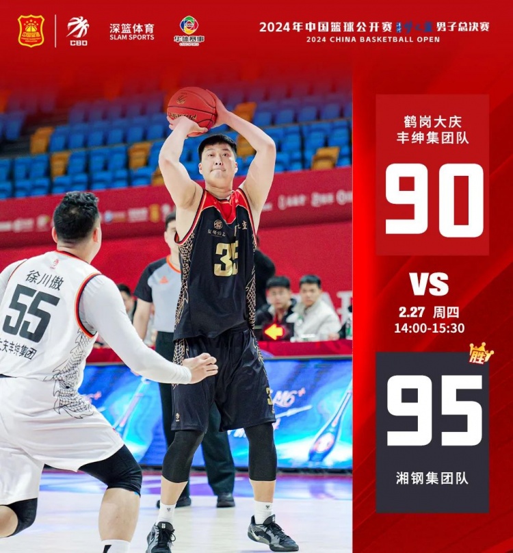 比賽開(kāi)始,兩隊(duì)上來(lái)比較慢熱。隨后大慶豐紳集團(tuán)積極拼搶前后場(chǎng)籃板,牢牢把握籃下優(yōu)勢(shì),率先取得領(lǐng)先。湘鋼集團(tuán)組織快攻,同時(shí)在外線穩(wěn)定輸出,緊咬比分。半場(chǎng)結(jié)束,大慶豐紳集團(tuán)48-46領(lǐng)先湘鋼集團(tuán)。下半場(chǎng),兩隊(duì)打得依舊膠著。末節(jié)90平后,湘鋼集團(tuán)26號(hào)陳雙三分命中,2號(hào)達(dá)斯坦·哈爾恒搶斷后上籃得分,幫助湘鋼集團(tuán)95-90戰(zhàn)勝大慶豐紳集團(tuán)。