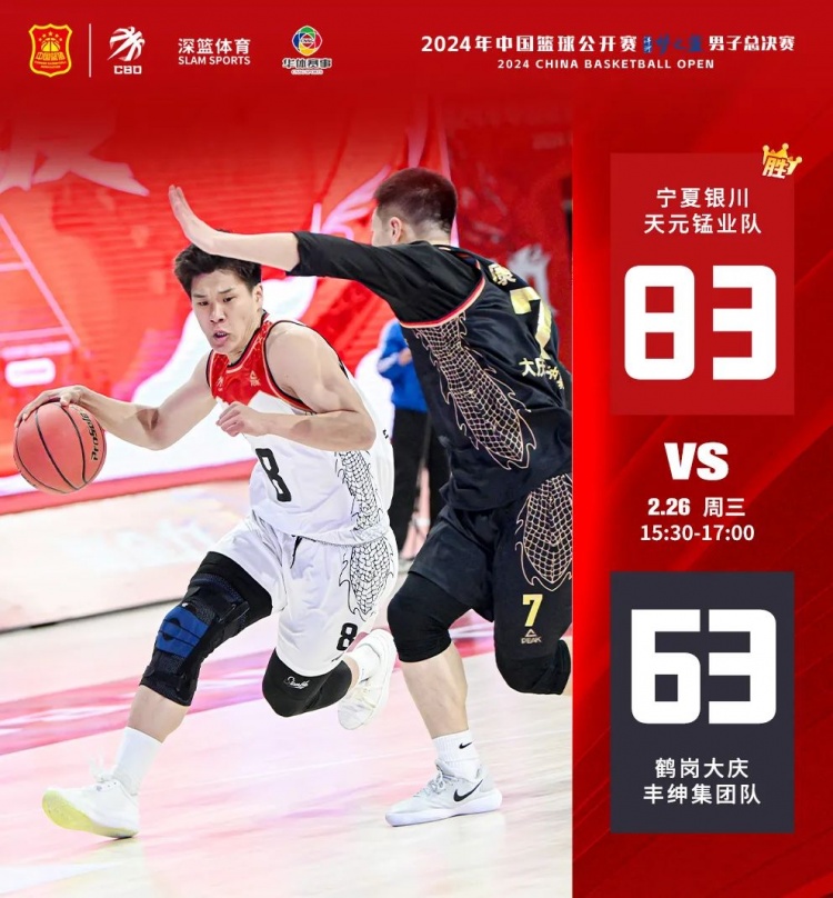 上半場,寧夏天元錳業(yè)一波7-0開局,打停大慶豐紳集團。暫?;貋?,寧夏天元錳業(yè)在搶到后場籃板后,積極組織快攻,11-1寧夏天元錳業(yè)領(lǐng)先。隨后大慶豐紳集團增強防守,同時手感開始回暖,但寧夏天元錳業(yè)在前后場籃板和進攻上發(fā)揮的更加出色。半場結(jié)束,寧夏天元錳業(yè)44-24大慶豐紳集團。下半場,寧夏天元錳業(yè)繼續(xù)保持進攻勢頭,最終天元錳業(yè)83-63大慶豐紳集團。
