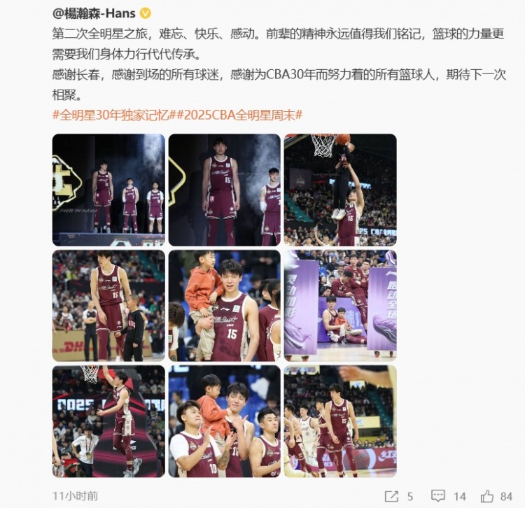 3月4日訊 今日,青島男籃球員楊瀚森更博,分享了全明星感受。