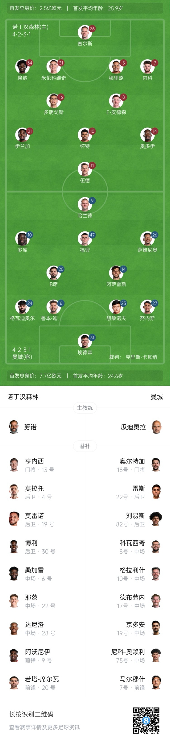 曼城客戰(zhàn)森林首發(fā):哈蘭德PK伍德!胡桑諾夫先發(fā),馬爾穆什替補(bǔ)