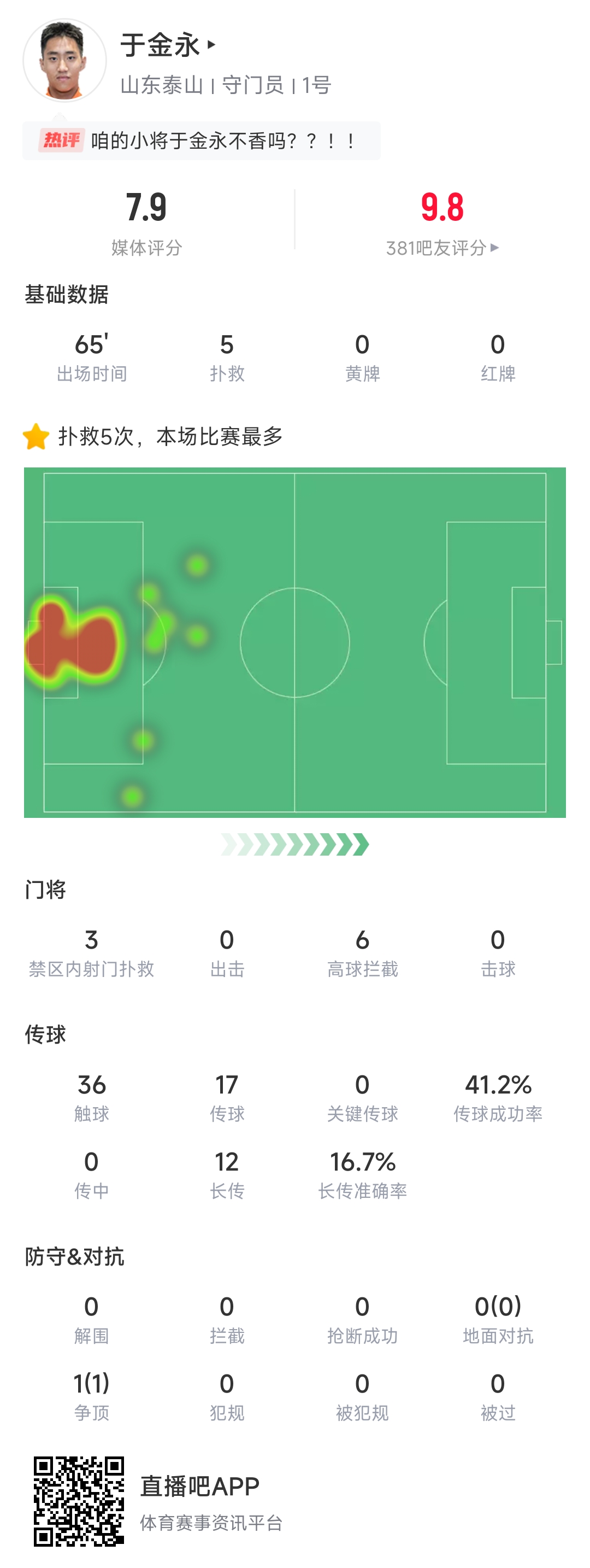 02月23日訊 中超第1輪,山東泰山主場0-0戰(zhàn)平河南隊,在首發(fā)門將王大雷第23分鐘就被紅牌罰下的情況下,20歲的替補(bǔ)門將于金永臨危救主,全場貢獻(xiàn)5次撲救,力保球門不失。