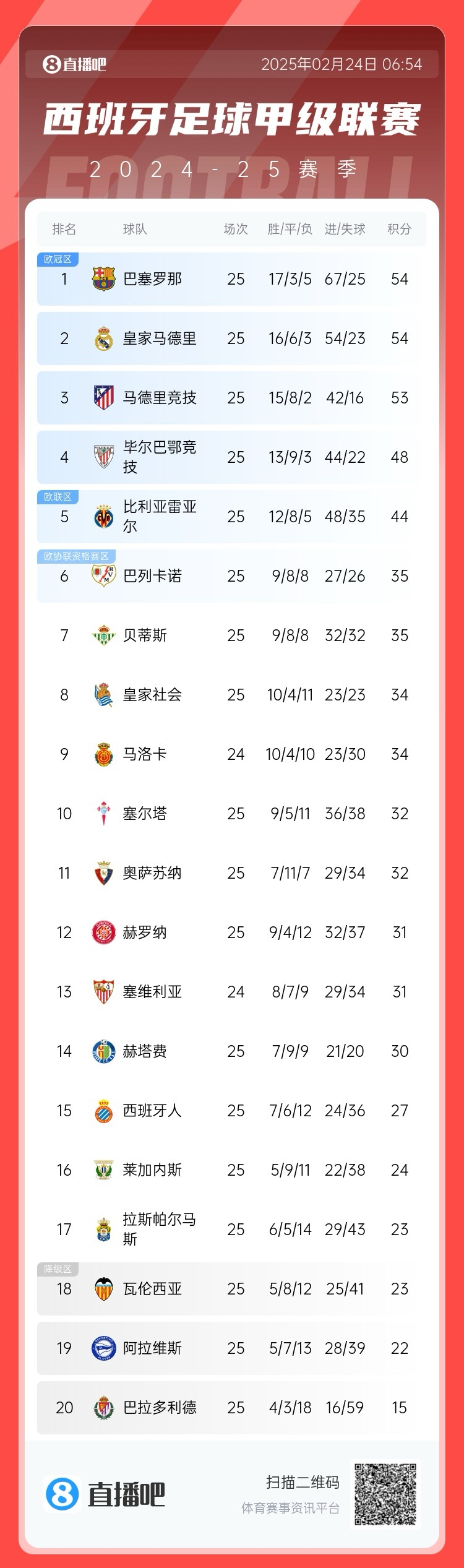 西甲積分榜:巴薩榜首,與皇馬同分、只領先馬競1分。
