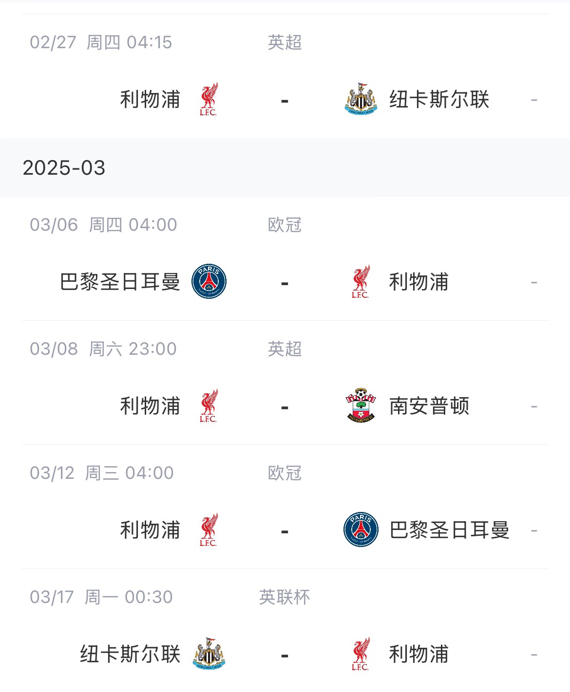 利物浦還剩11輪英超,下輪他們將對(duì)陣紐卡,4月底將迎來關(guān)鍵階段,接連對(duì)陣熱刺、切爾西、阿森納等隊(duì)。此外,利物浦歐冠1/8決賽將對(duì)陣巴黎,足總杯他們已被淘汰,聯(lián)賽杯則打進(jìn)決賽將對(duì)陣紐卡。