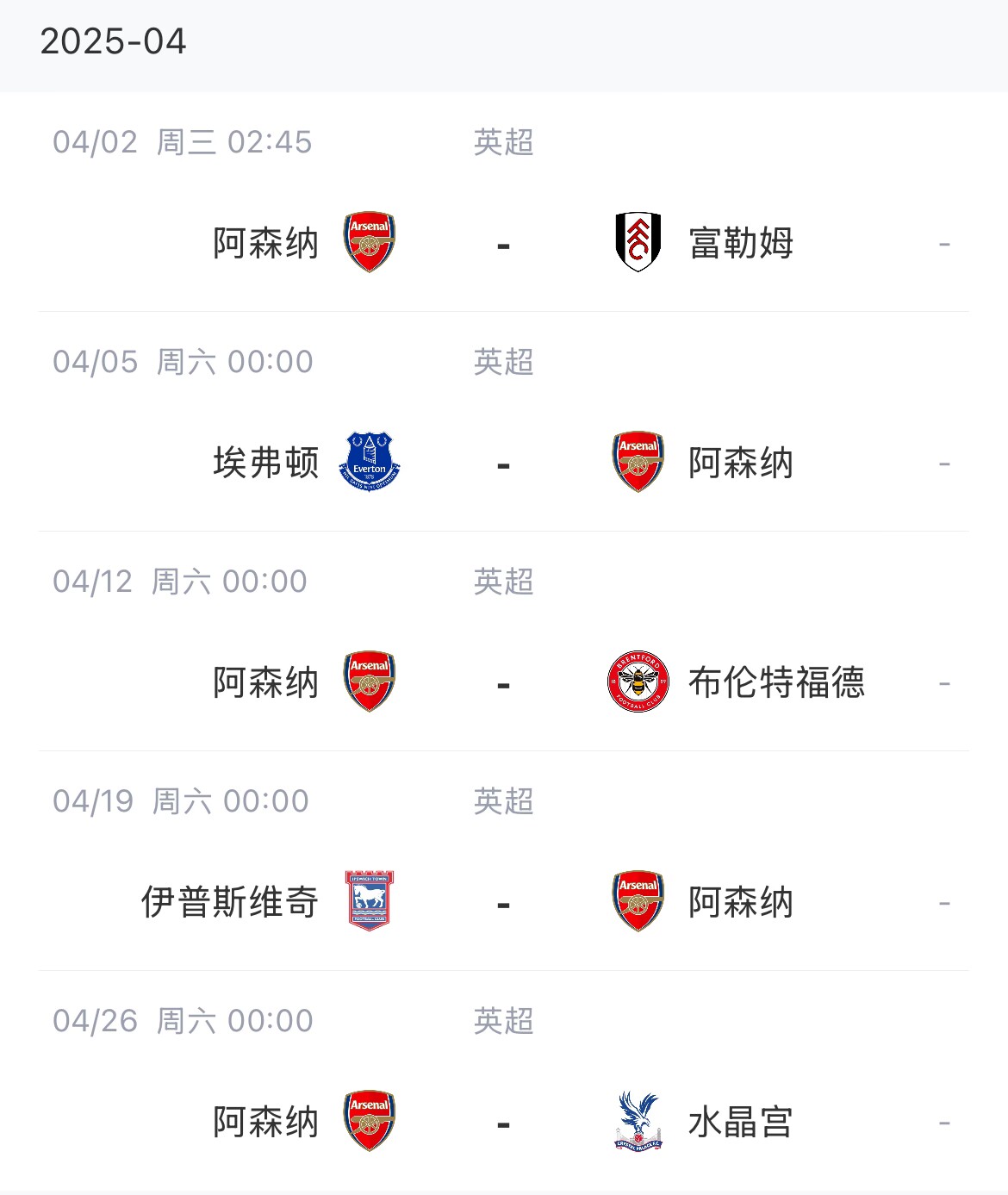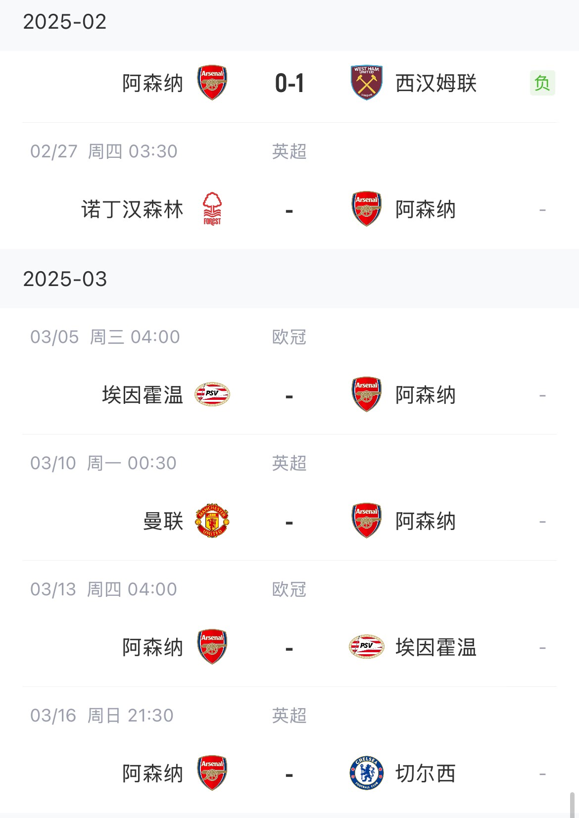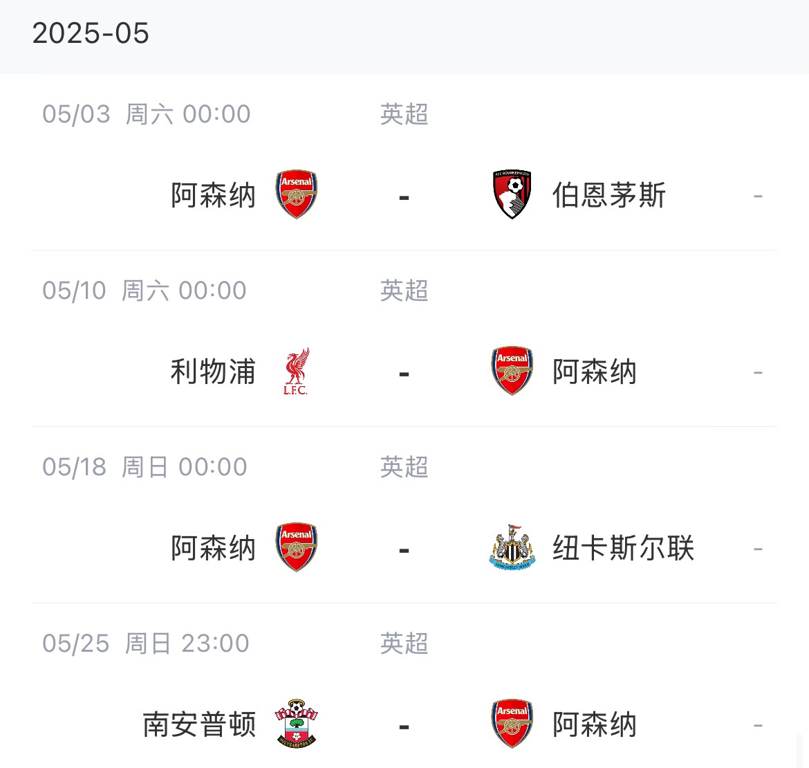 阿森納還剩12輪英超,接下來他們將先后對(duì)陣森林、曼聯(lián)和切爾西,5月中旬需連戰(zhàn)利物浦和紐卡。歐冠1/8決賽阿森納將對(duì)陣埃因霍溫,足總杯和聯(lián)賽杯他們均已出局。