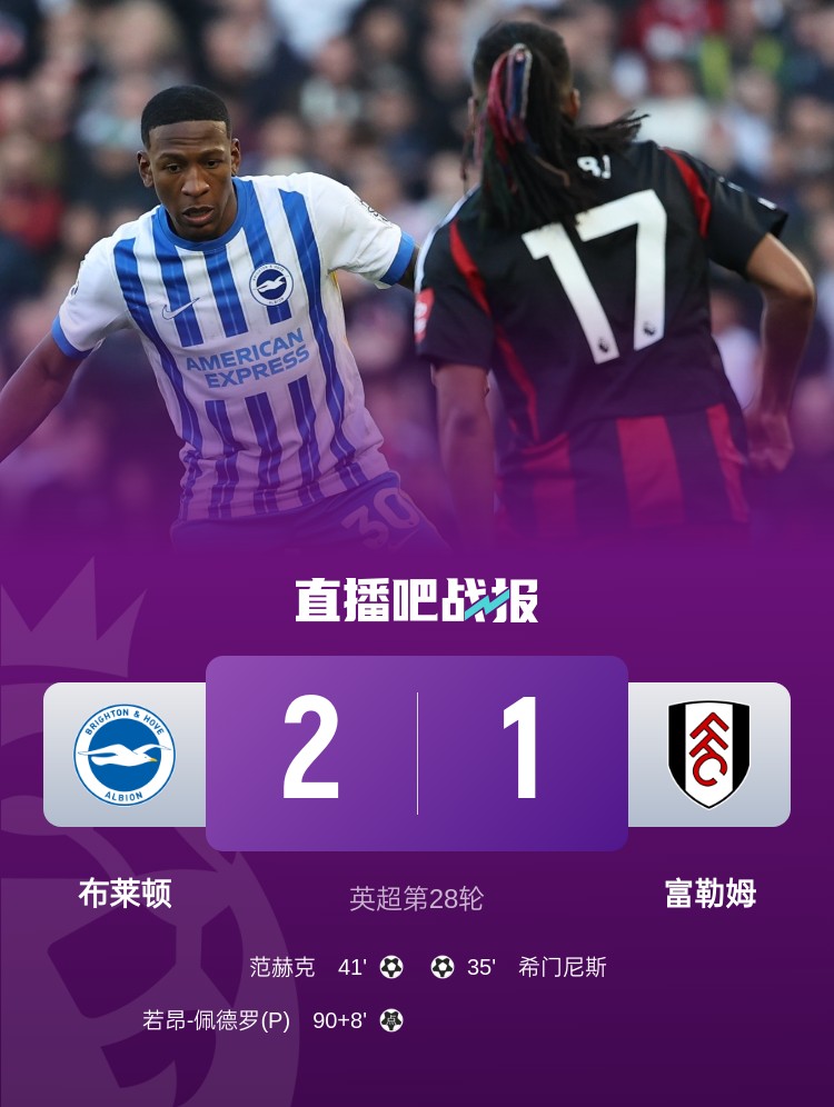 聯(lián)賽四連勝!布萊頓2-1逆轉(zhuǎn)富勒姆升第六 佩德羅讀秒點(diǎn)射絕殺