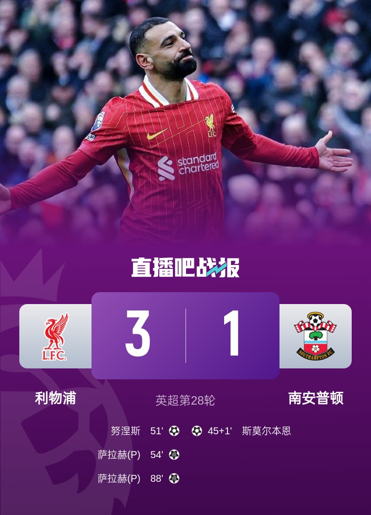 英超第28輪,利物浦3-1逆轉(zhuǎn)南安普頓。上半場(chǎng),利物浦防線出現(xiàn)失誤,斯莫爾伯恩破門(mén);下半場(chǎng),努涅斯破門(mén)+造點(diǎn),薩拉赫點(diǎn)射,菅原由勢(shì)手球送點(diǎn),薩拉赫點(diǎn)射再中。