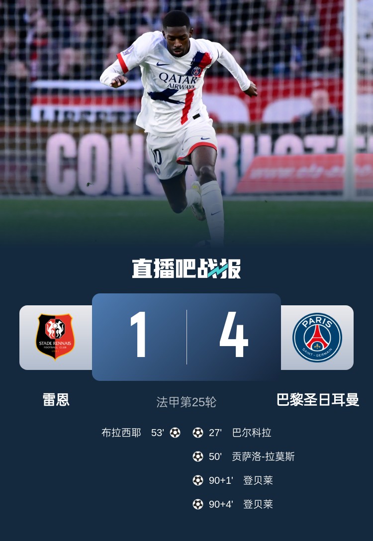 25輪不??!巴黎4-1雷恩先賽16分領(lǐng)跑 登貝萊替補(bǔ)補(bǔ)時(shí)3分鐘雙響