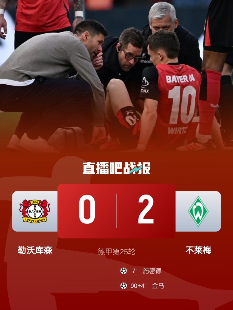 德甲第25輪,勒沃庫(kù)森0-2不敵不萊梅,結(jié)束23輪不敗。上半場(chǎng),斯塔格助攻施密德破門(mén),維利科維奇進(jìn)球被吹越位,阿萊克斯-加西亞任意球中框;下半場(chǎng),替補(bǔ)登場(chǎng)的維爾茨傷退,伯克打入一球被吹越位,金馬鎖定勝局。