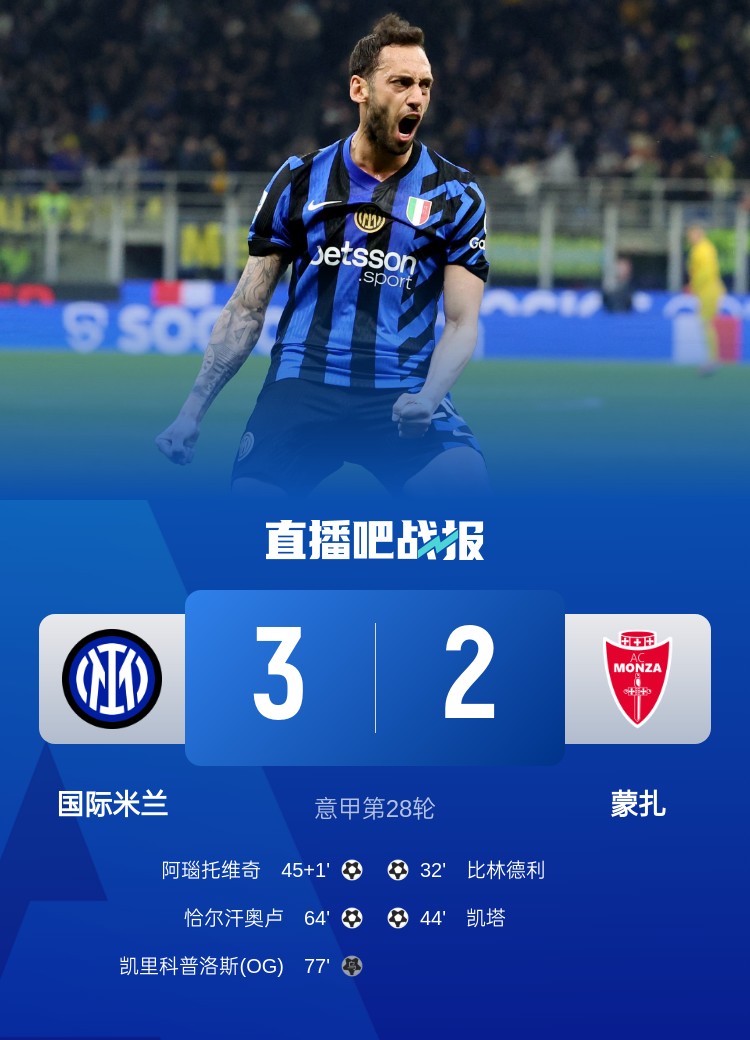 意甲第28輪,國(guó)米3-2逆轉(zhuǎn)蒙扎。上半場(chǎng),勞塔羅破門(mén)被吹無(wú)效,圖拉精彩撲救,比林德利首開(kāi)記錄,凱塔遠(yuǎn)射世界波,阿瑙托維奇扳回一城;下半場(chǎng),恰爾漢奧盧凌空抽射扳平,勞塔羅頭球造烏龍,小圖拉姆推射中柱。