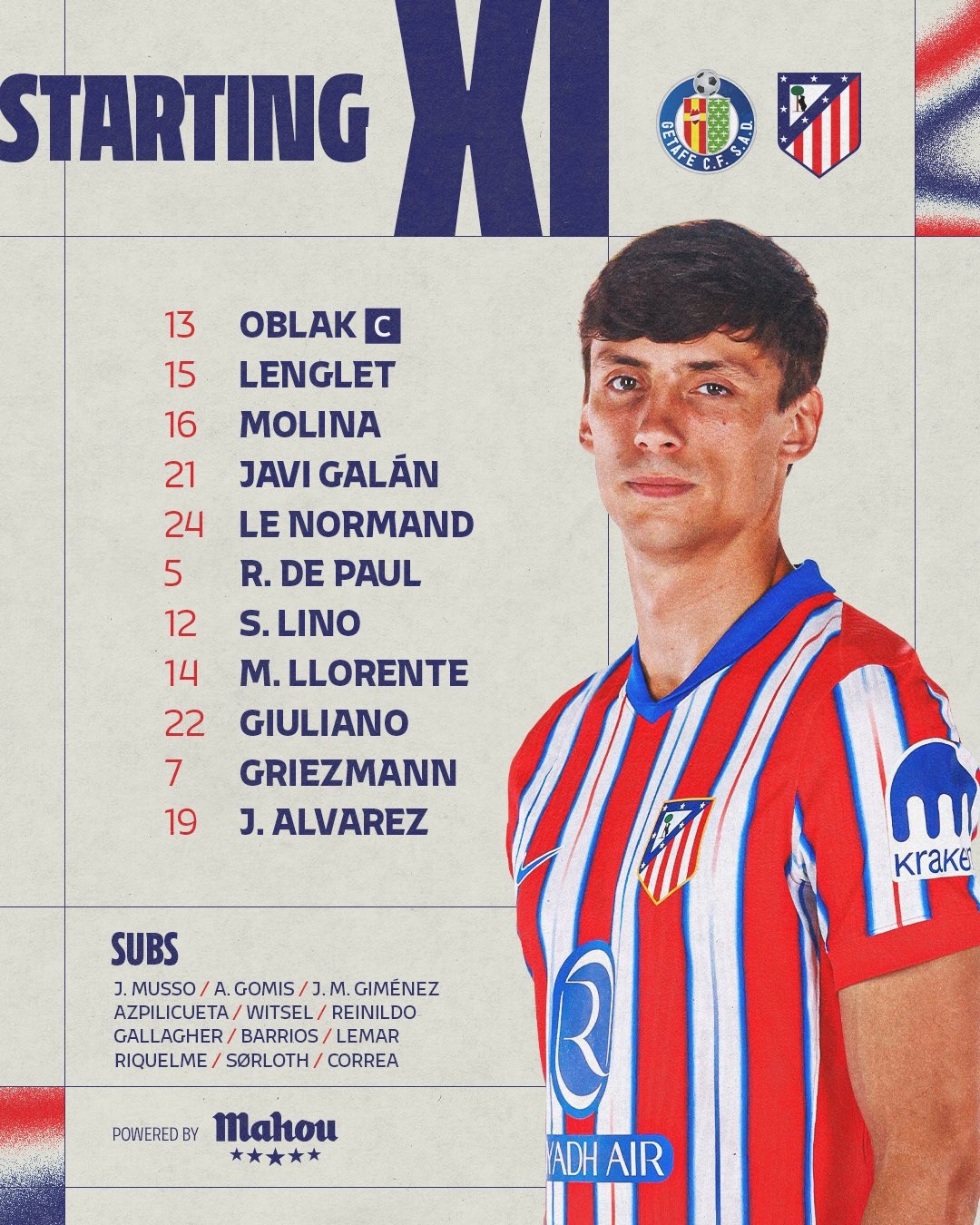 馬競(jìng)首發(fā):13-奧布拉克、15-朗格萊、16-莫利納、21-哈維-加蘭、24-勒諾爾芒、5-德保羅、14-馬科斯-略倫特、12-利諾、22-朱利亞諾-西蒙尼、7-格列茲曼、19-阿爾瓦雷斯