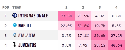 國米:73.3%;那不勒斯:22%;亞特蘭大:3.7%;尤文:0.8%