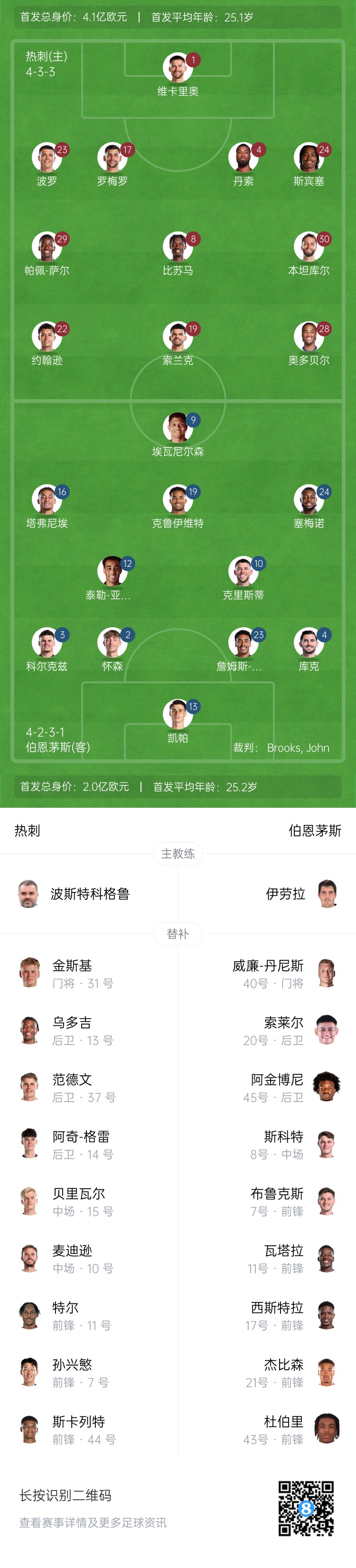 熱刺首發(fā):1-維卡里奧、23-波羅、17-羅梅羅、4-丹索、24-斯賓塞、30-本坦庫爾、8-比蘇馬、29-佩普-薩爾、22-布倫南-約翰遜、19-索蘭克、28-奧多貝爾
