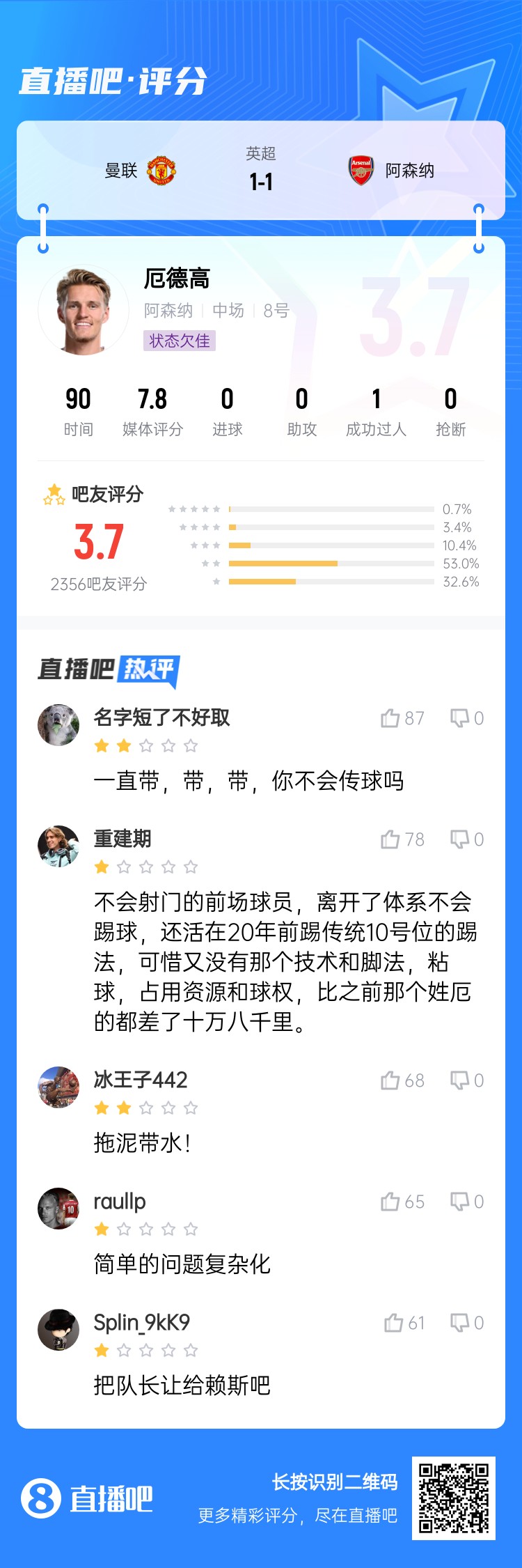 英超第28輪,阿森納客場(chǎng)1-1戰(zhàn)平曼聯(lián)。厄德高本場(chǎng)比賽首發(fā)踢滿全場(chǎng),發(fā)揮糟糕。