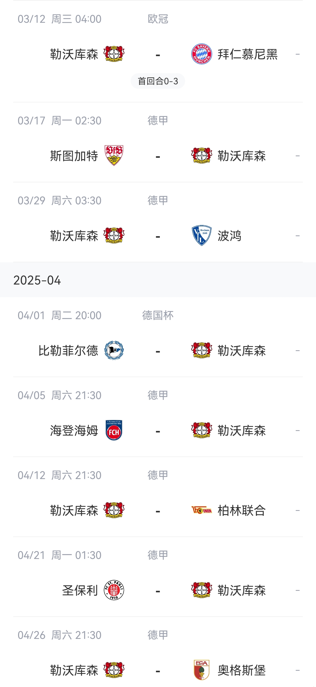 勒沃庫森未來賽程↓