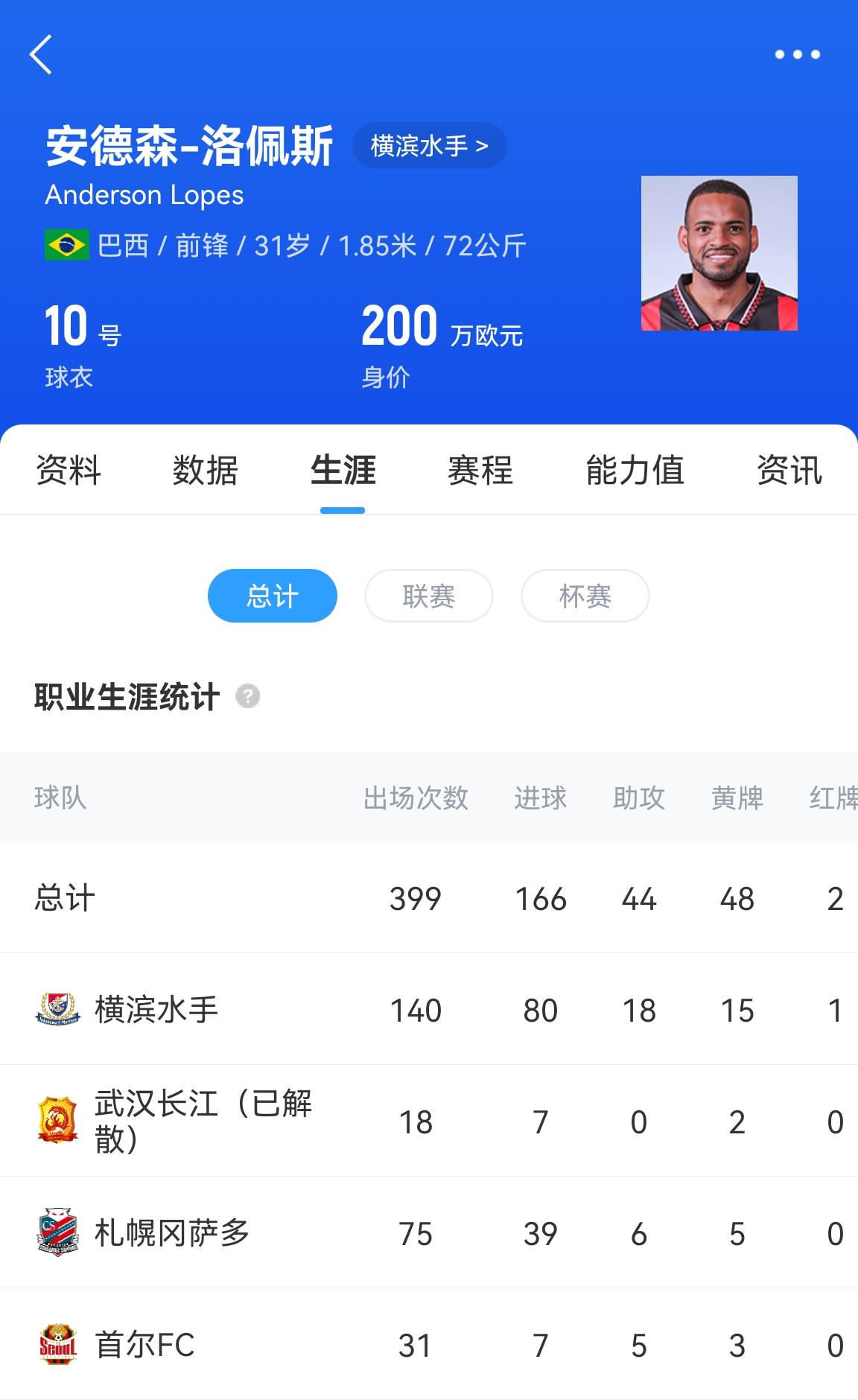 安德森-洛佩斯曾短暫效力中超聯(lián)賽,2021賽季,洛佩斯代表武漢隊出場18次打入7球。2022年2月,武漢隊官宣洛佩斯加盟橫濱水手,轉(zhuǎn)會費180萬美元。就在這次官宣不到一年后,武漢隊宣布解散。