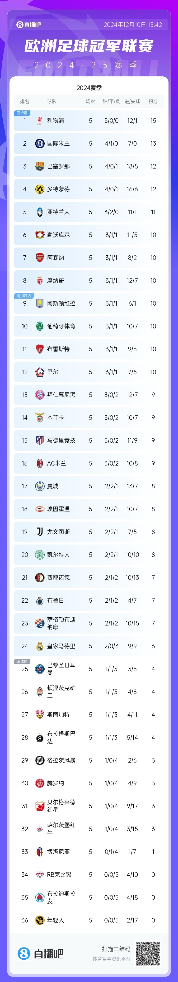 歐冠5輪之后的積分榜: