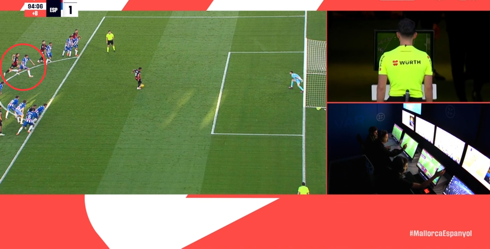 第92分鐘,VAR介入,主裁親自查看回放,此前西班牙人球員和馬略卡球員同時(shí)提前進(jìn)入禁區(qū)?。ň嚯x點(diǎn)球點(diǎn)不滿9.15米),并對(duì)比賽產(chǎn)生影響,主裁判罰點(diǎn)球重罰