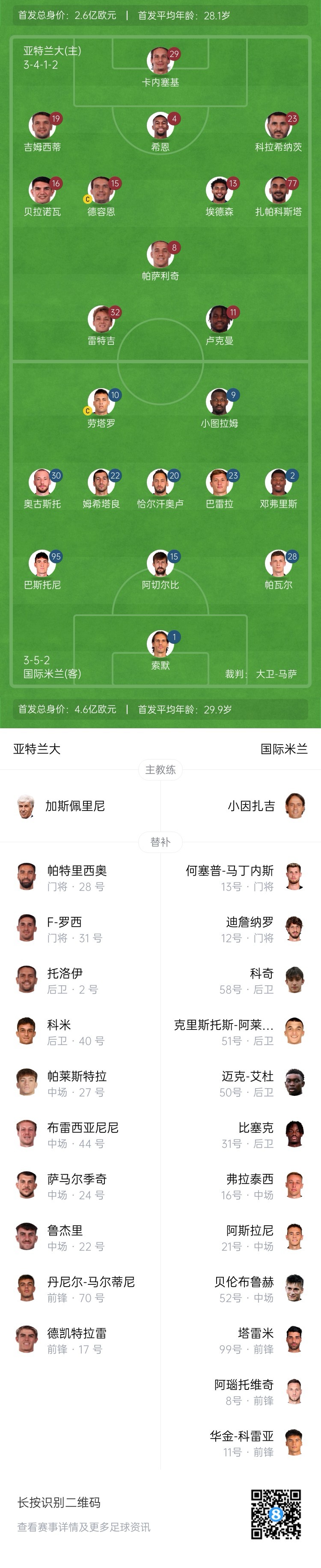 亞特蘭大替補:28-帕特里西奧、31-F-羅西、2-托洛伊、17-德凱特拉雷、22-魯杰里、24-薩馬爾季奇、27-帕萊斯特拉、40-科米、44-布雷夏尼尼、70-丹尼爾-馬爾蒂尼
