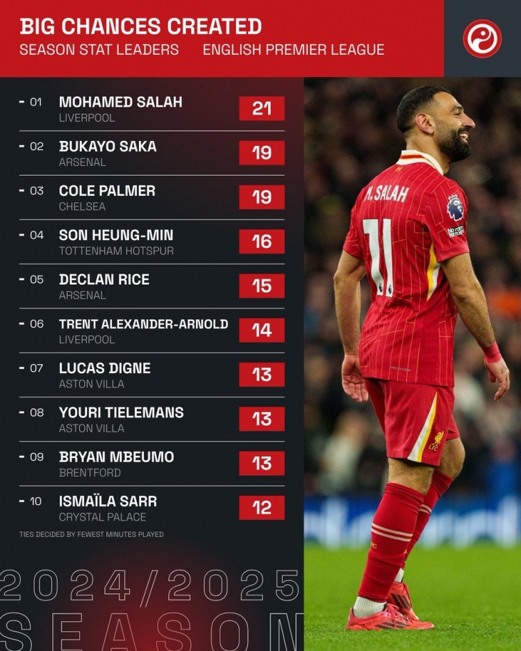 本賽季英超創(chuàng)造重大機(jī)會(huì)榜:薩拉赫21次居首,薩卡&帕爾默19次