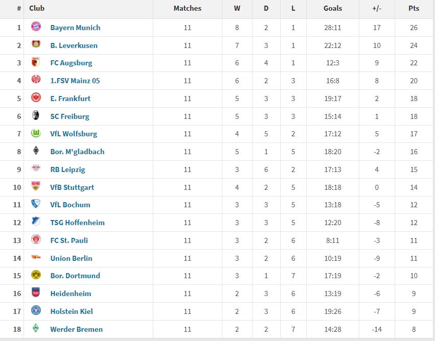 德甲2025年度積分榜:拜仁26分居首,藥廠次席,多特僅10分居倒四