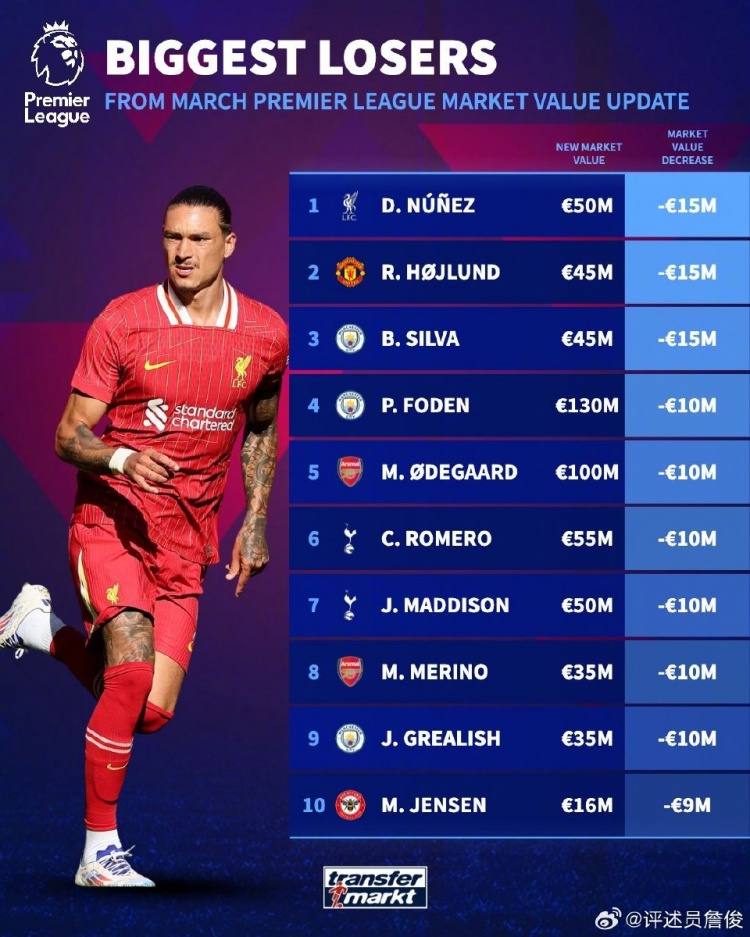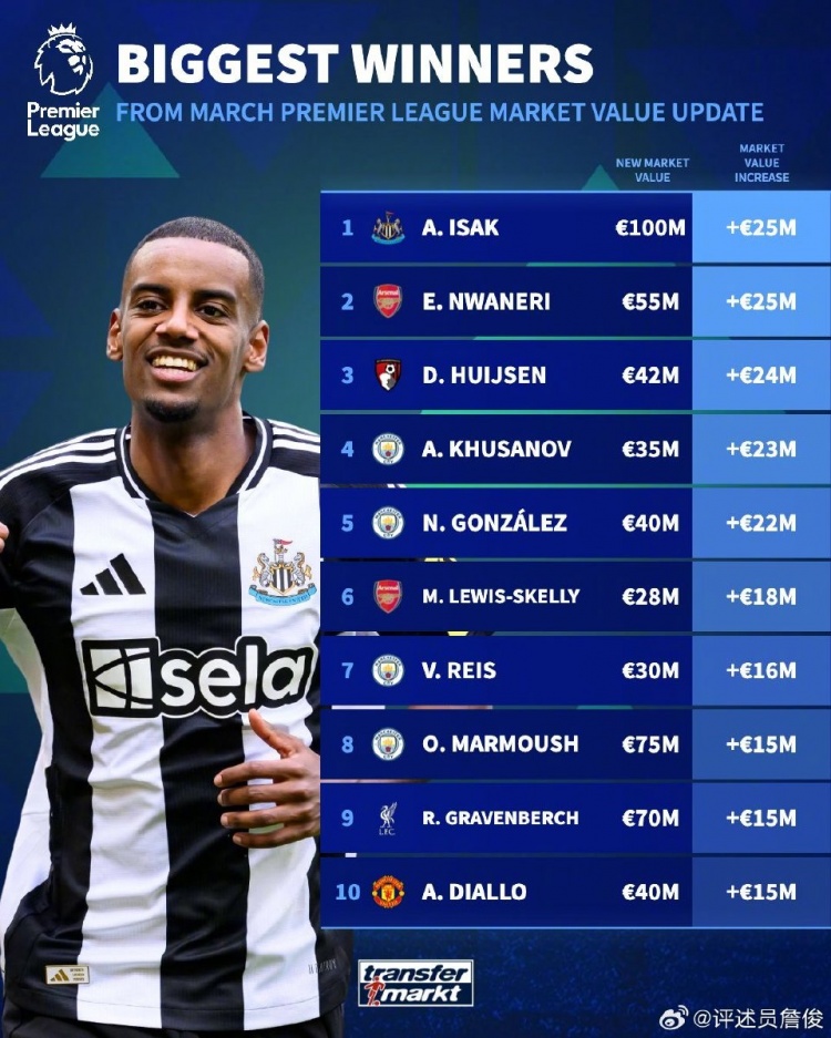 球員身價漲幅方面,伊薩克、恩瓦內(nèi)利以2500萬歐的漲幅并列最多;跌幅方面,努涅斯、霍伊倫、B席均下跌1500萬歐并列最多,槍手中場梅里諾下跌1000萬歐,并列排第4位。