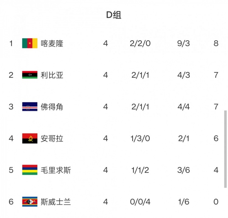 D組:8次參加世界杯的喀麥隆占據(jù)榜首,利比亞、佛得角、安哥拉緊隨其后