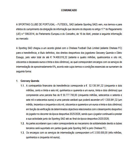 03月20日訊 葡萄牙體育官方消息,昆達(dá)、埃蘇戈將加盟切爾西,兩人轉(zhuǎn)會(huì)費(fèi)共計(jì)7400萬歐。