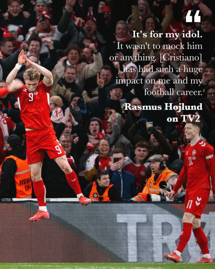3月21日訊 歐國(guó)聯(lián)1/4決賽首回合中,丹麥1-0擊敗葡萄牙,霍伊倫破門(mén)后模仿了C羅標(biāo)志性的Siu慶祝動(dòng)作。