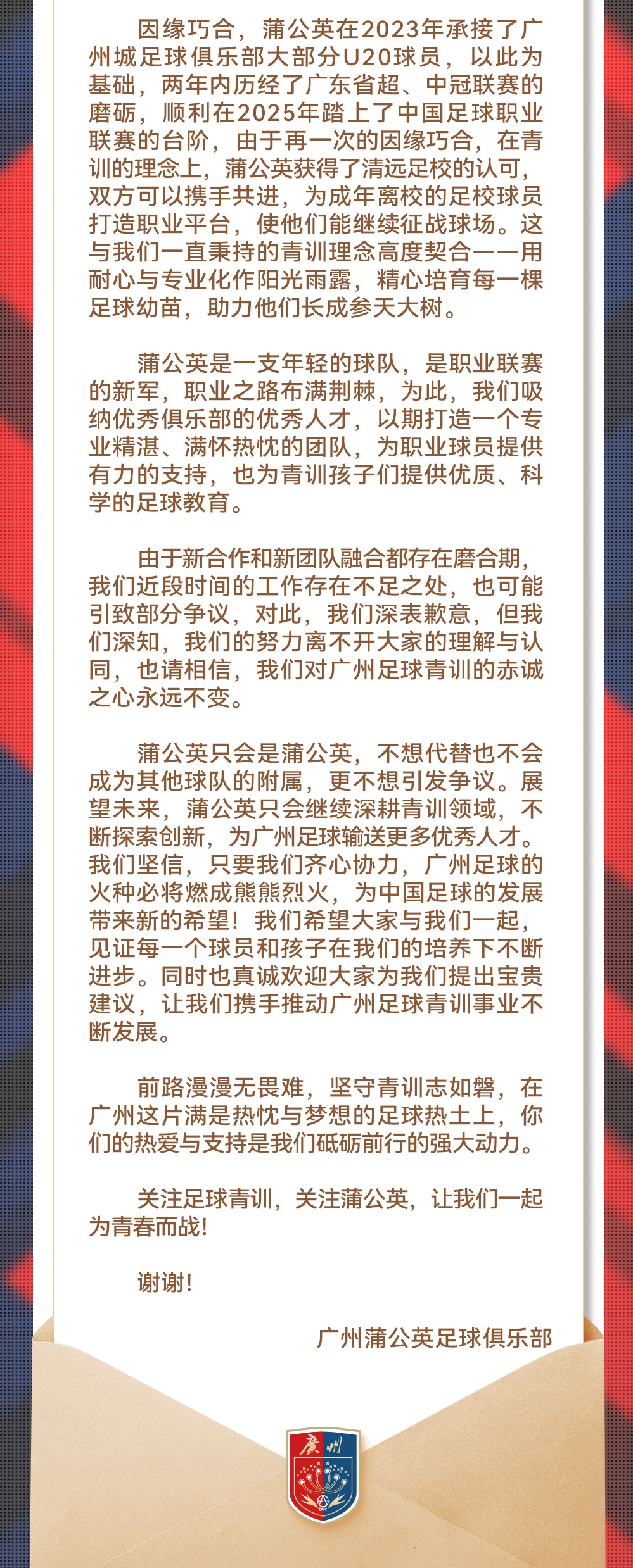 由于新合作和新團(tuán)隊(duì)融合都存在磨合期,我們近段時間的工作存在不足之處,也可能引致部分爭議。對此,我們深表歉意,但我們深知,我們的努力離不開大家的理解與認(rèn)同,也請相信,我們對廣州足球青訓(xùn)的赤誠之心永遠(yuǎn)不變。