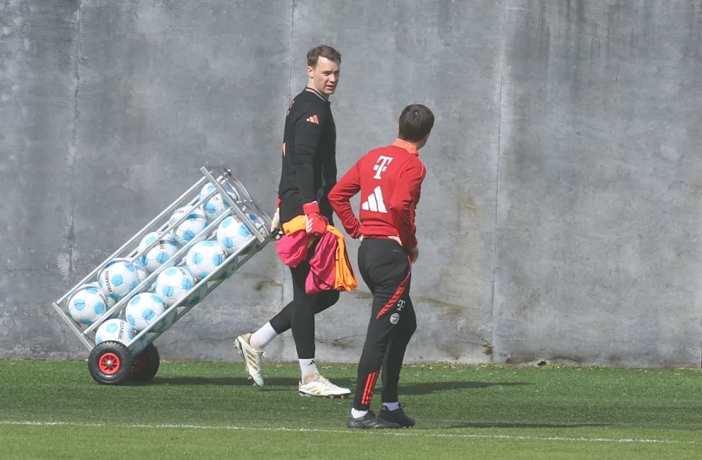 訓練情況原本和以往一樣順利,但僅僅35分鐘后訓練就結(jié)束了。諾伊爾被看到和教練員一起收起足球,他跳過了跑動部分的訓練,推著球車慢慢走回更衣室,最終未能完成當日的訓練。顯然,他的小腿出現(xiàn)了肌肉反應。