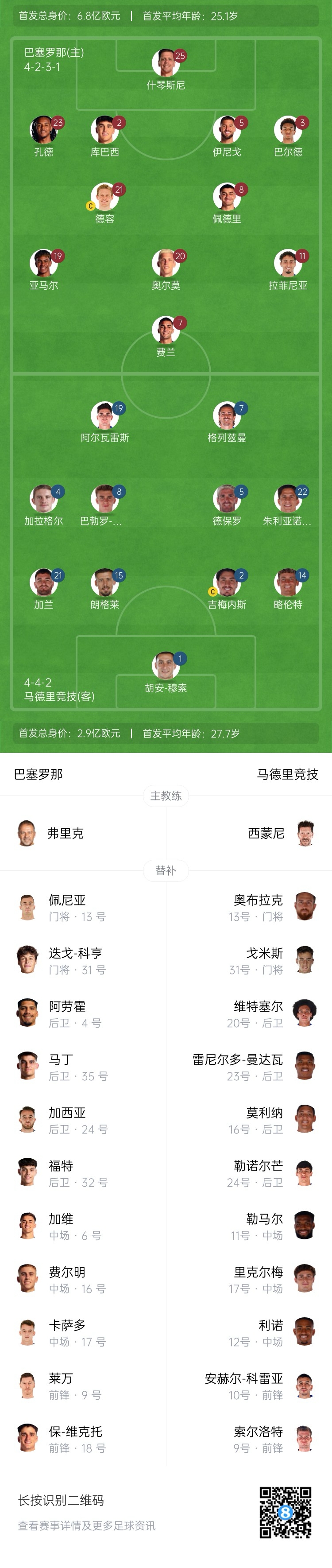 巴薩首發(fā):25-什琴斯尼、2-庫(kù)巴西、3-巴爾德、5-伊尼戈-馬丁內(nèi)斯、23-孔德、8-佩德里、20-奧爾莫、21-德容、7-費(fèi)蘭-托雷斯、11-拉菲尼亞、19-亞馬爾