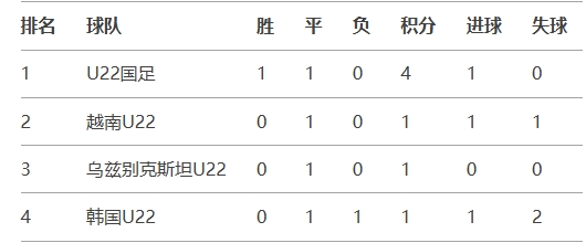 U22邀請(qǐng)賽積分榜:U22國足1勝1平0失球暫居第一,末輪對(duì)陣越南
