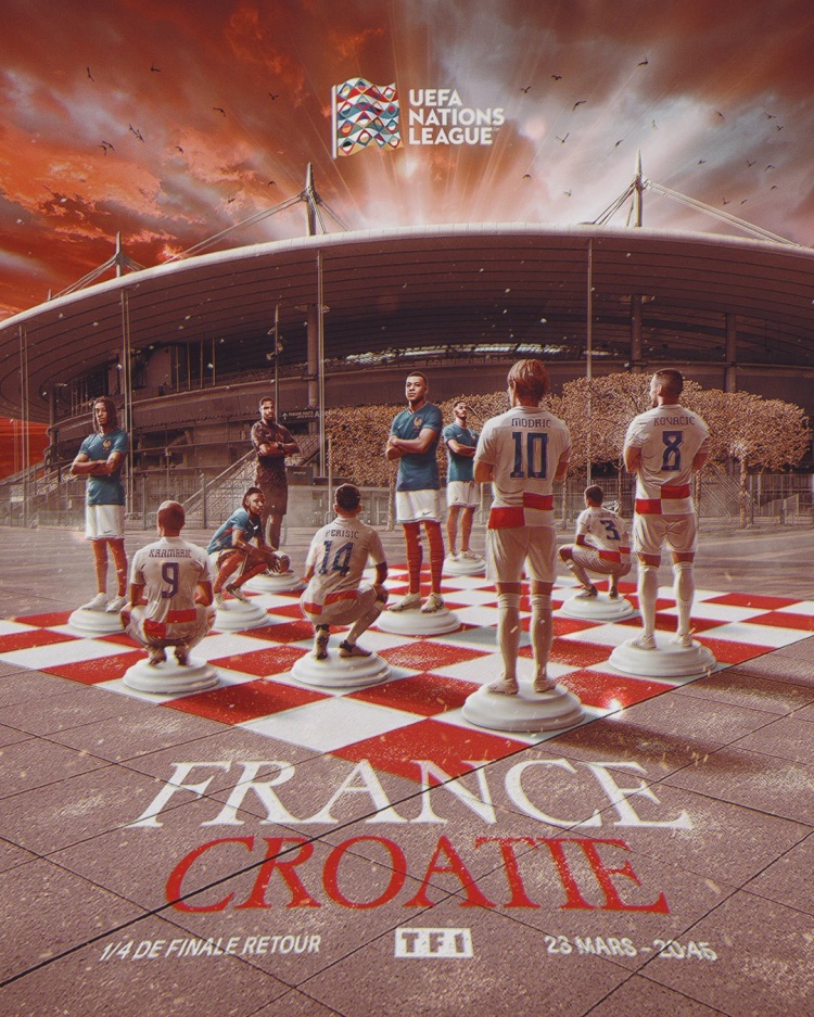 法國(guó)隊(duì)官方社媒發(fā)布了為次回合制作的海報(bào),內(nèi)容為兩隊(duì)球員在球場(chǎng)外的棋盤(pán)上對(duì)峙,姆巴佩、莫德里奇領(lǐng)銜出鏡。